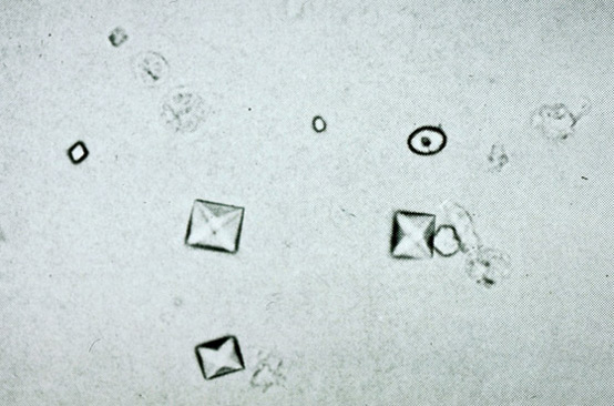 La whewellite H20 est une forme rare de cristallisation d’oxalate de calcium. Elle cristallise sous forme de feuillets monocliniques mais dans la majorité des cas celle-ci précipite sous forme de lamelles ovales. La présence de whewellite sous forme de structures ovoïdes fortement agglutinés, de structures jumelles, de microlithes dans l’urine serait l’indication d’une précipitation massive pathologique.