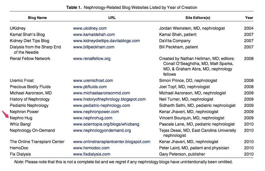 Comme vous pouvez le voir sur ce tableau réalisé par le blog de l’AJKD, les « Nephrology-Related Blog Websites » sont plutôt d’origine anglo-saxonne. Je ne connais que l’excellent PerrUche en Automne comme blog qui parle aussi de néphrologie et en français.